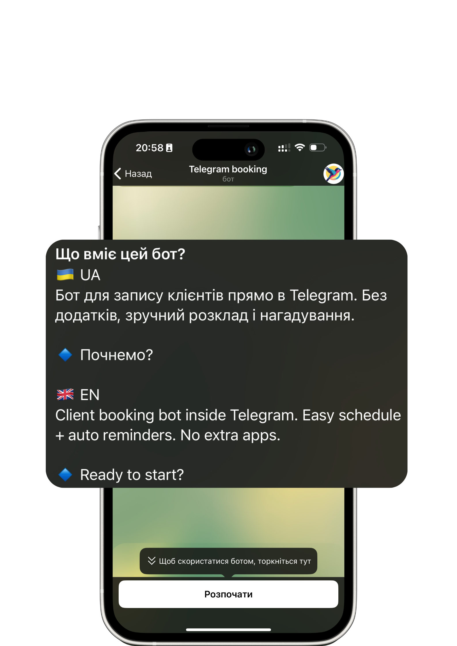 Empower small businesses with a seamless online booking experience directly through Telegram. It enables business owners to effortlessly set up their service offerings and available hours, while clients can conveniently schedule appointments to receive services